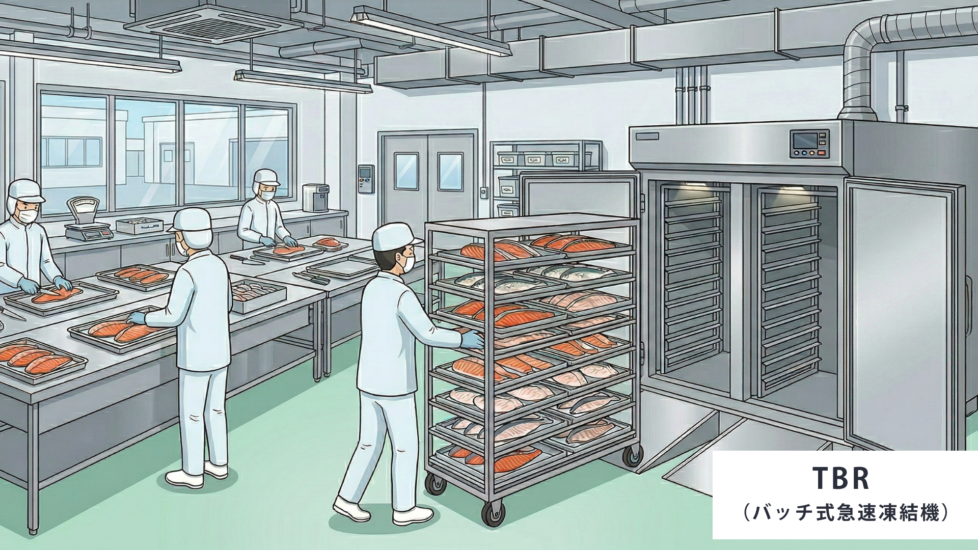 「人件費 削減」を急速凍結で進めるなら、現場に合う設備かどうかが最重要です。連続設備やトンネルフリーザーが合う工場もありますが、現実には「連続式までは不要」「ラインを大きく変えたくない」「少量多品種で日々品目が変わる」「今ある設備に追加してピークだけ吸収したい」という工場が多くあります。そうした条件の中で、省人化と品質安定の両方を狙いやすいのが、バッチ式急速凍結機「TBR」です。ロット(台車)単位で凍結でき、品目に合わせて条件を変えやすいので、現場の運用を崩さずに凍結工程の負担を軽くしやすい考え方が取れます。ここでは、導入を検討するときの見方を、現場の悩みに結び付けて整理します。