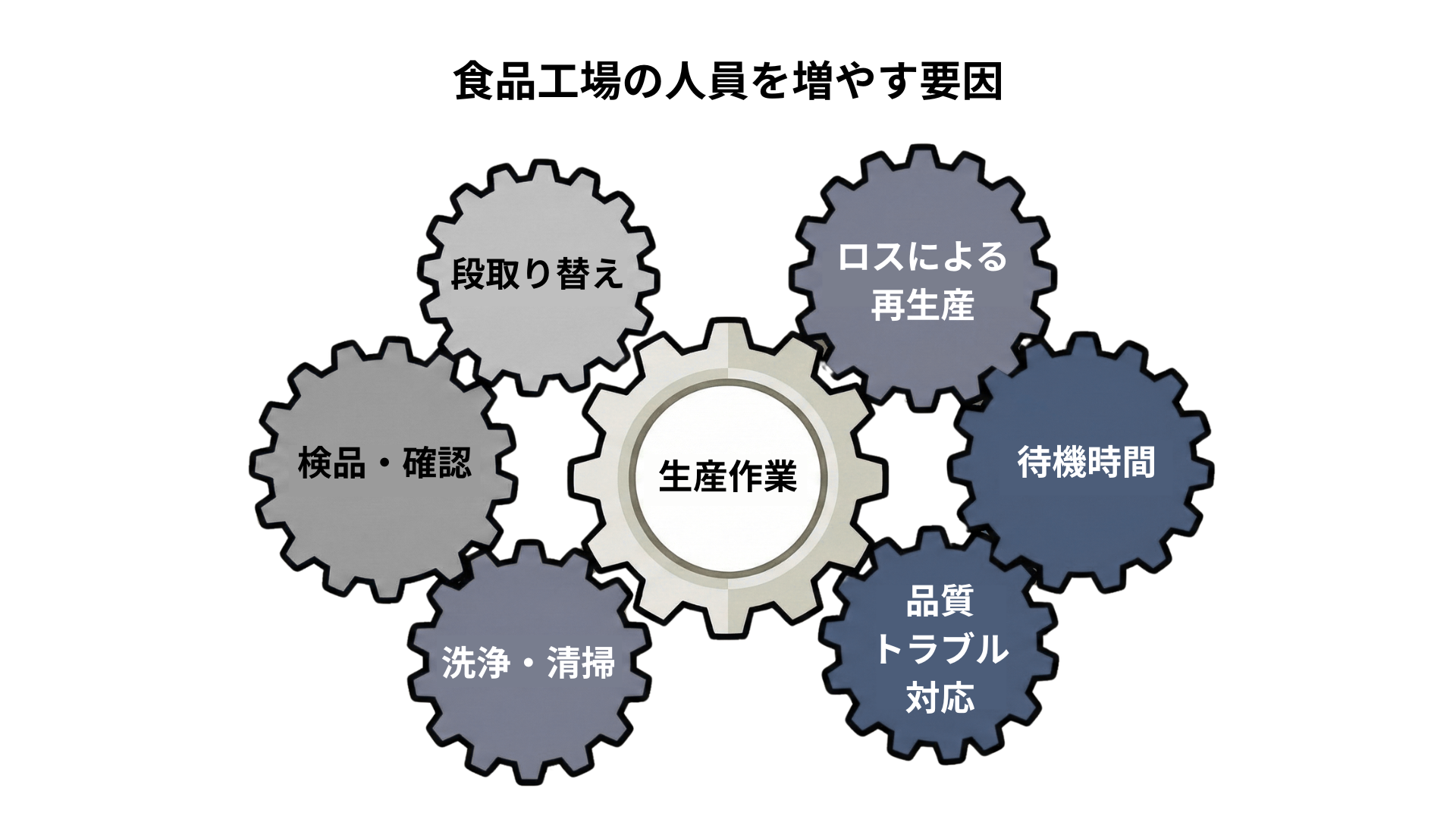 食品加工は、原材料の下処理、カット、味付け、加熱、冷却、盛付け、包装、保管、出荷と工程が多く、さらに品目が増えるほど段取りが増えます。多品種・小ロットになると、工程が複雑化し、洗浄や清掃、包材の入れ替え、確認作業が増えます。こうした作業は生産量を増やす行為ではなく、現場を正しく回すための必要作業ですが、回数が増えると人手を押し上げます。
