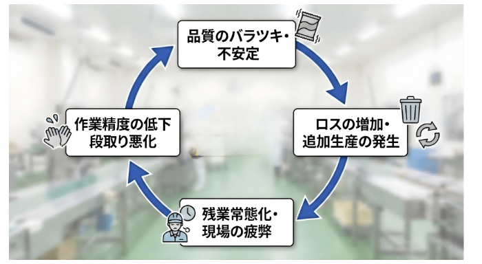 一つ目は、原材料費の上昇や歩留まりの悪化で、売上は同じでも粗利益が削られるパターンです。例えば生産品質のブレで規格外が増えると、同じ出荷量を確保するために余分に作る必要が出て、原価が上がります。二つ目は、人手不足や段取りの複雑化で、残業や応援が常態化し、営業利益が削られるパターンです。生産が計画通りに進まず、最後は残業で取り返す運用になると、人件費がじわじわ増えます。三つ目は、繁忙期に生産が追いつかずに受注を取りこぼす機会損失です。機会損失は帳簿上のコストに見えにくく、経営上は大きな痛手になります。