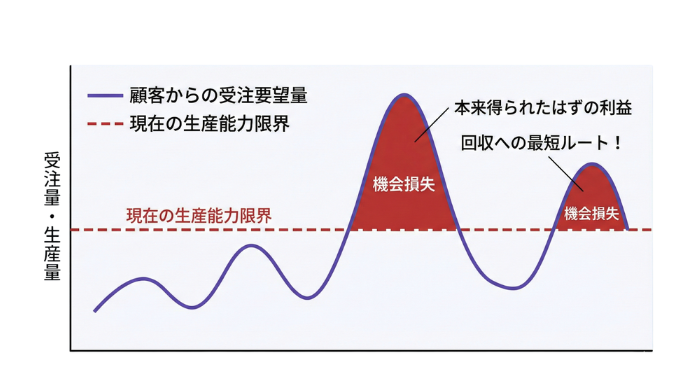 回収を早めるうえで、意外に見落とされがちなのが繁忙期の機会損失です。機会損失は、設備や人が足りずに「受注を断った」「生産納期が合わず取り逃した」といった損失で、帳簿上のコストとしては見えにくいです。しかし、回収という観点では非常に大きいです。なぜなら、回収を早める最短ルートは、利益が出る仕事を増やすことだからです。