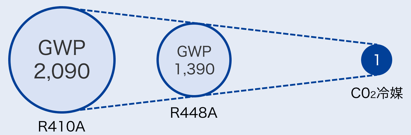 - 温暖化係数(GWP)がフロン冷媒に比べ約1/1400~1/2000