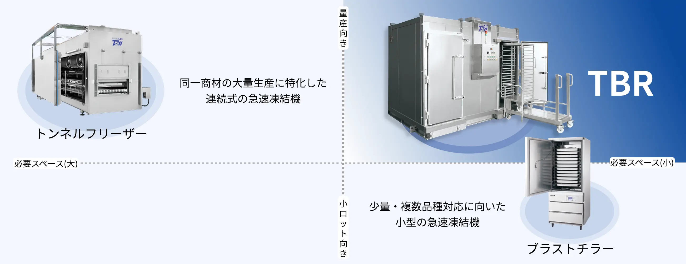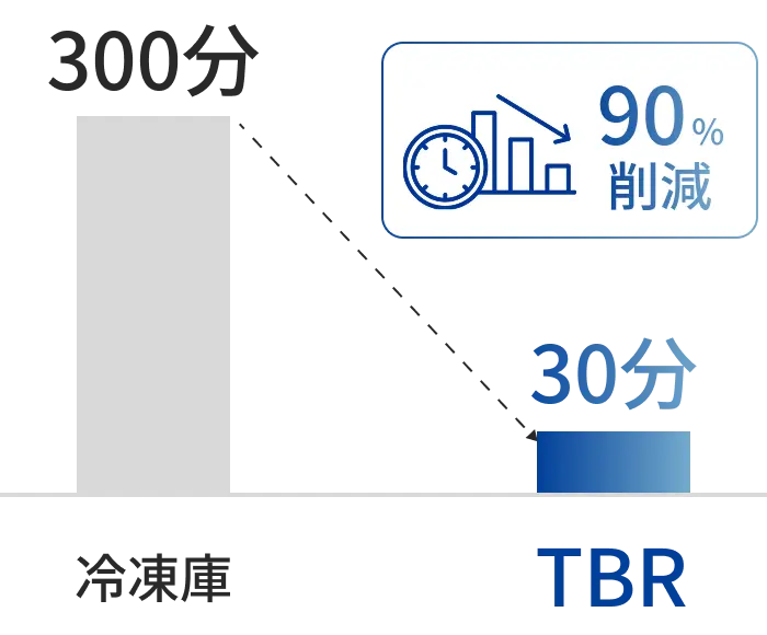 限られたスペースに設置可能なうえ、トンネルフリーザーと変わらない高品質な冷凍を行うことができるTBRを高く評価いただいております。